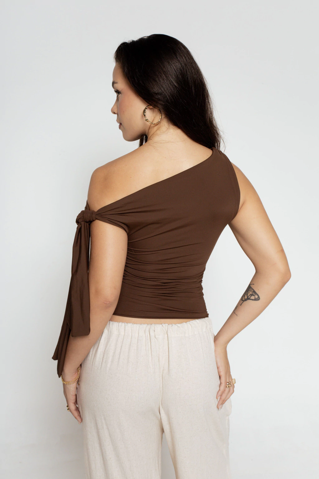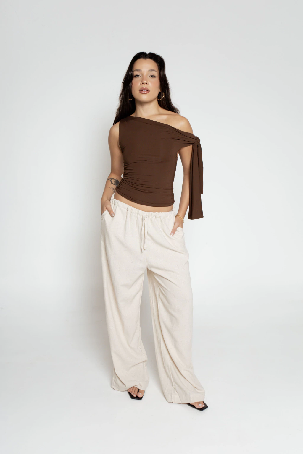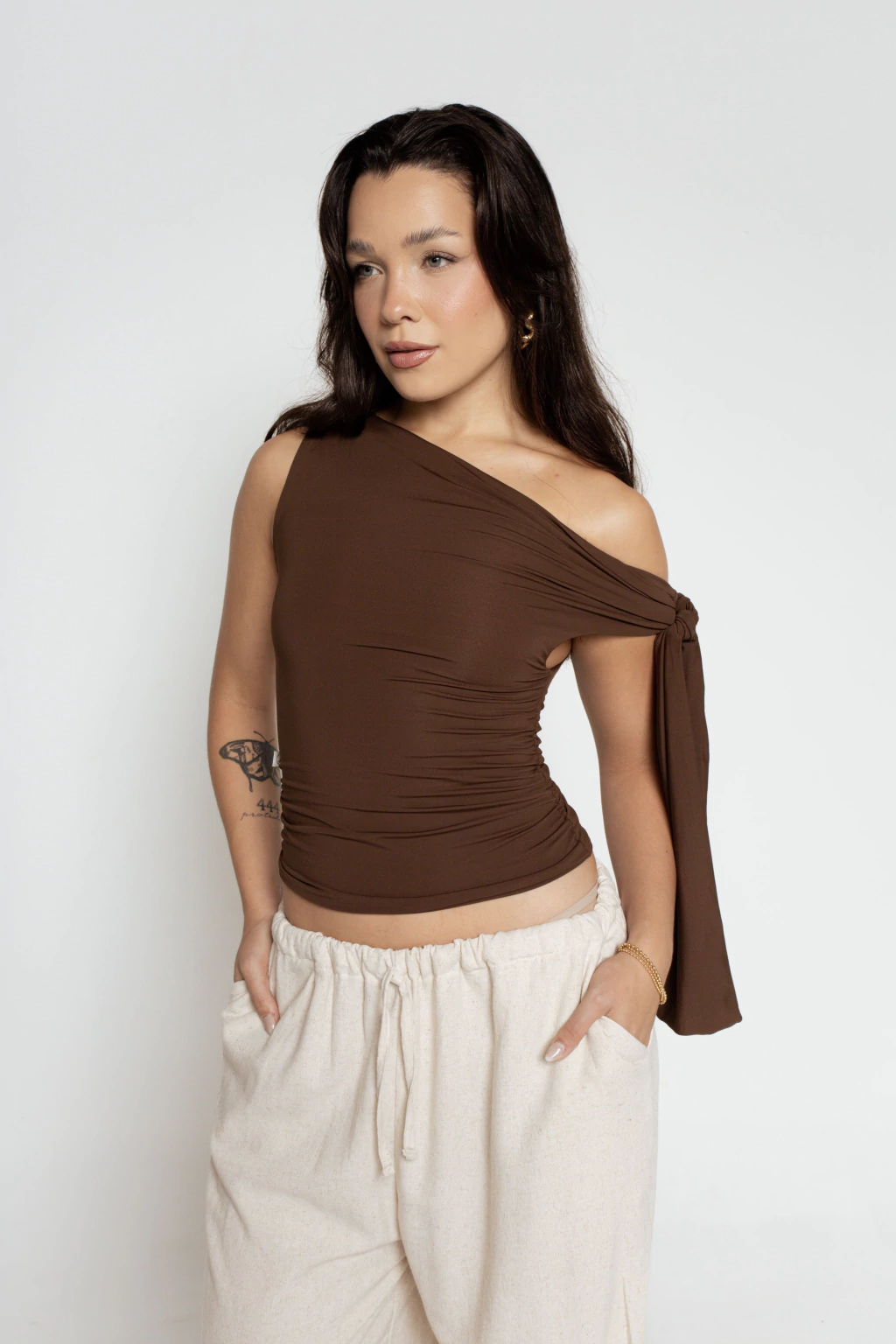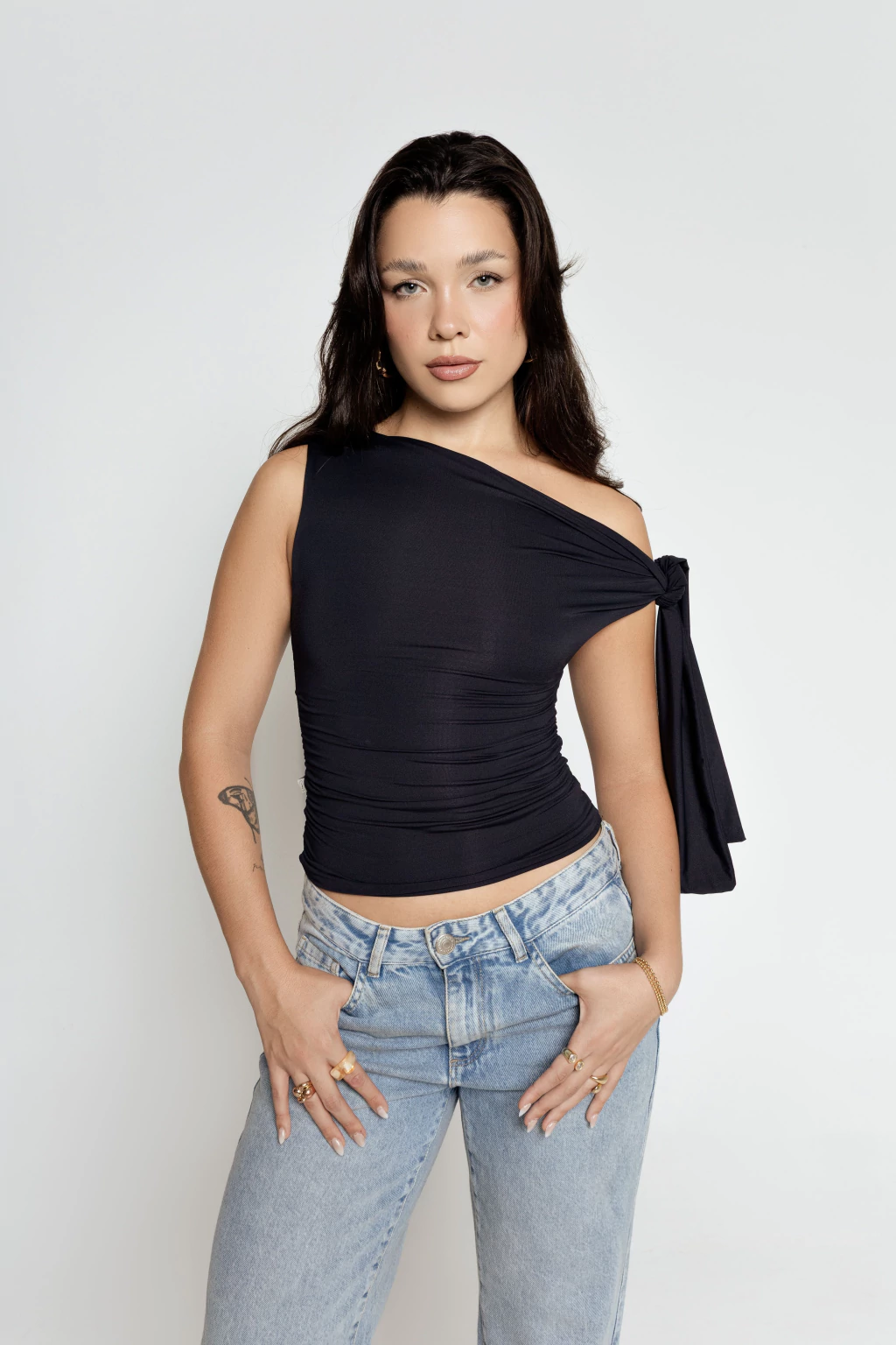 o modelo apresenta modelagem de ombro caído e detalhe de amarração ajustável na lateral. a peça possui corpo levemente drapeado, que valoriza o caimento e o conforto. a poliamida de alta qualidade assegura um toque suave e facilidade de manutenção para o uso diário.